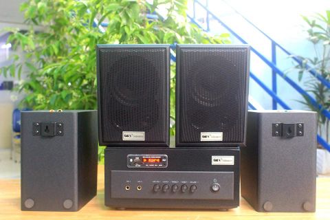 Gồm: 01 âm ly A381 (2 khu âm thanh riêng biệt) + 04 loa vệ tinh V25C