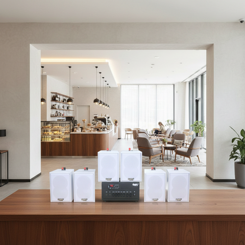 Dàn âm thanh quán cafe A384PU-2K + 6 V25C màu trắng chuyên lắp cho Quán Cafe, Nhà hàng, Quán ăn, Spa, Khu tập Gym, shop thời trang, văn phòng công ty, khu vui chơi, cửa hàng tạp hoá, siêu thị nhỏ...