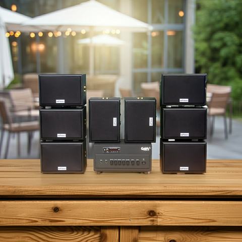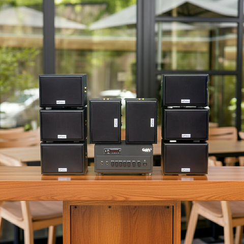 Goldsound xin giới thiệu: Combo dàn âm thanh quán cafe sân vườn giá rẻ A384PU-2K + 8 loa V101-NT Goldsound dành riêng lắp không gian ngoài trời, trước cửa quán của Quán Cafe, Nhà hàng, Quán ăn, Spa, khu vui chơi...