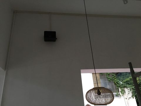 Loa thiết kế nhỏ gọn, màu đen dễ dàng phối màu với không gian của quán