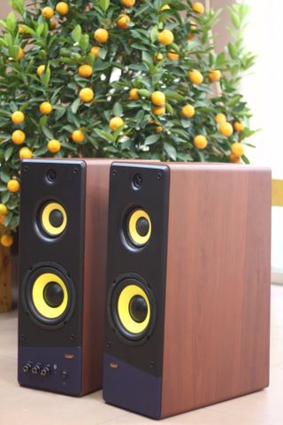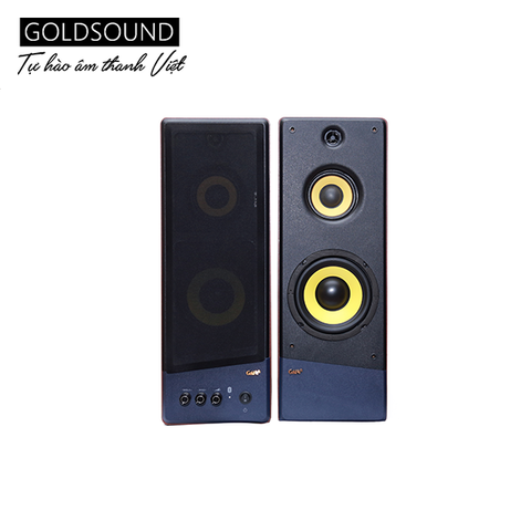 GoldHifi - Bluetooth là dạng loa 2.0 nên sẽ có duy nhất 2 thùng loa. Hai thùng loa này không được làm hình hộp chữ nhật như đơn thuần mà có các góc nghiêng nhẹ ở mặt trước và cạnh trên, đem lại cảm giác bớt nhàm chán hơn trong thiết kế. Loa có hộp âm được làm hoàn toàn bằng gỗ, phủ bên ngoài một lớp PVC vân gỗ. Lần này GoldSound chọn lớp vẫn gỗ này ngả vàng nhiều hơn, sẽ thích hợp với kệ tủ đồ gỗ cổ điển kiểu Việt Nam.