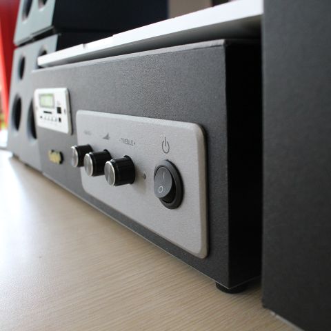 Chiếc ampli có tổng công suất 80W phù hợp với các hộ gia đình và được thiết kế dạng nằm nên có thể làm kệ đặt màn hình hay laptop. Trong khi đó, 4 loa vệ tinh được thiết kế theo một hình khối giống nhau với phần mặt trước được cắt một góc 15 độ. Còn chiếc loa bass có thiết kế hình hộp màng loa hướng thiên.