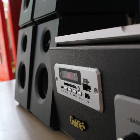 Tương tự các mẫu anpli gần đây của GoldSound, chiếc ampli trong bộ dàn này có bảng điều khiển tích hợp đèn LCD hiển thị chế chộ và thời lượng của bài hát, phía dưới là các phím bấm chuyển chế độ cùng khe cắm thẻ USB và thẻ SD.