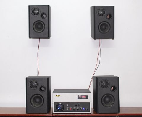 4 loa vệ tinh có đầy đủ loa bass, loa trebl trên 1 thùng loa, mỗi loa có công suất 30w.
