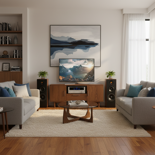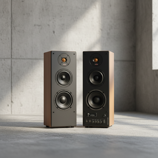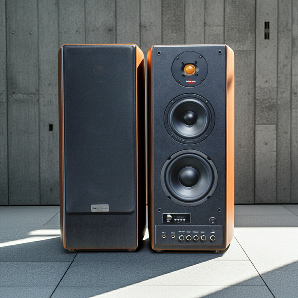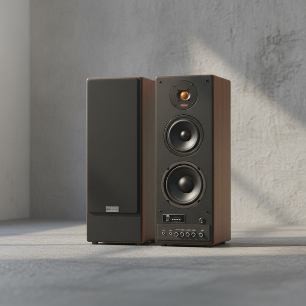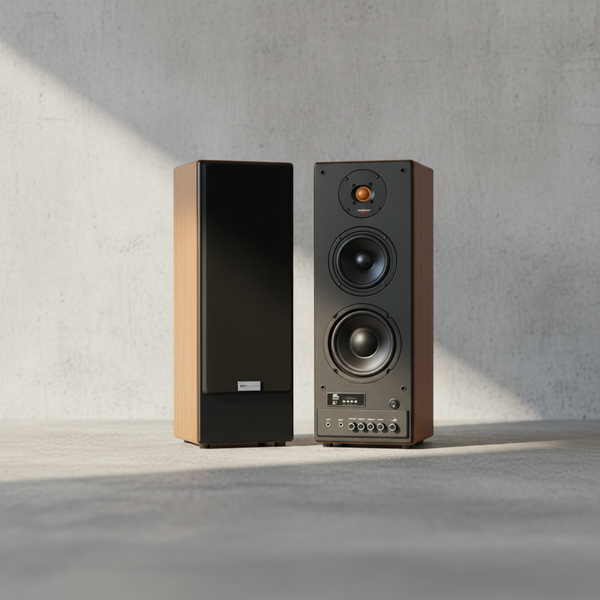 Mặt sau loa gồm các cổng kết nối và lỗ thoát khí khuếch đại âm thanh, bạn nên đặt loa cách tường bằng khoảng 1/3 – 1/5 chiều dài phòng hoặc tối thiểu 30cm.