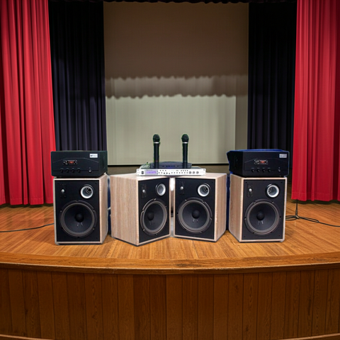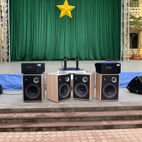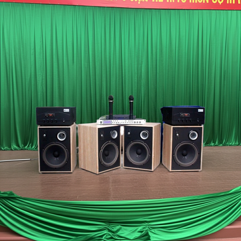 Cấu hình: 6 loa chuyên dụng 230w + 3 cục đẩy 1200w+ 1 Vang rời + 4 Micro không dây.
