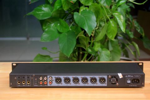 Mặt sau của vang bao gồm: Công tắc nguồn, các cổng kết nối tin hiệu vào, ra thông dụng. Tất cả được chú thích rõ ràng: Cổng cắm Micro và chỉnh độ nhạy Micro, cổng cắm quang, đầu vào nhạc AV, ra thu âm, các ngõ ra loa