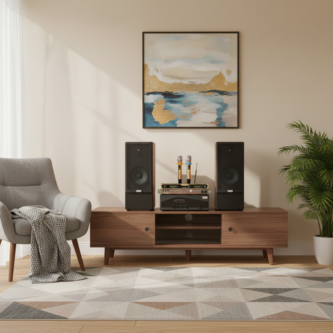 Dàn Karaoke K385 thiết kế đứng hiện đại chuyên dụng cho nhu cầu karaoke, nghe nhạc cho phòng hát gia đình, phòng khách không gian từ 15-35m2