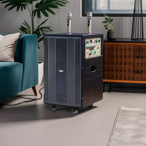 Hệ thống 4 bánh xe quay 360 độ, dễ dàng di chuyển. Kết nối đa dạng Bluetooth, Audio input, Audio output, USB, TF card, Guitar, Mic 1, Mic 2, Speaker output. Đi kèm 2 Micro không dây UHF hát hay