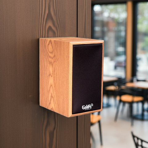 Loa vệ tinh âm trần dành riêng cho quán được thiết kế với thùng gỗ cộng hưởng âm.