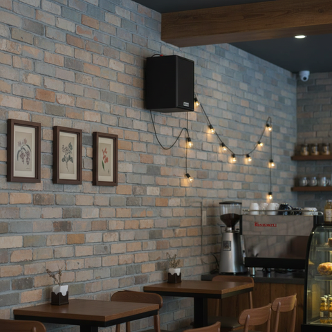 Thùng loa được thiết kế với màu đen, phù hợp phối mầu cùng các không gian dành cho quán Cafe, Nhà hàng, Quán ăn, Spa, Khu tập Gym.