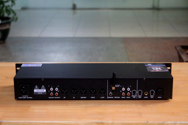 Mặt sau của vang bao gồm: Công tắc nguồn, các cổng kết nối tin hiệu vào, ra thông dụng, ngõ vào micro A, micro B. Tất cả được chú thích rõ ràng. Vang số NS V2 được trang bị đường vào AUX1, AUX2, optical, cổng COAXIAL, và đường tín hiệu đầu ra: R OUT, L OUT, SUB OUT, SR, SL